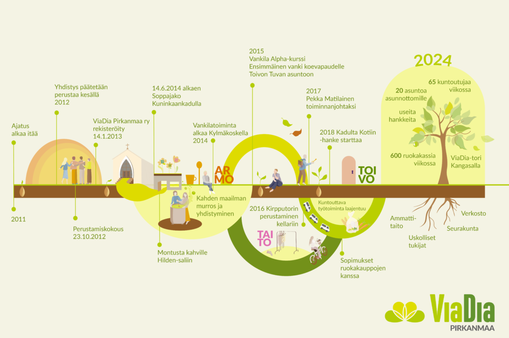 Tyhjästä on tullut todellista – ViaDia Pirkanmaa on elävä yhteisö välittäviä, Jumalaa ja lähimmäistä rakastavia ihmisiä. Työskentelemme yhä saman näyn jatkumona, joka eli monien seurakuntalaisten sydämissä yli 10 vuotta sitten. Palvelu, joka muuttaa elämää.